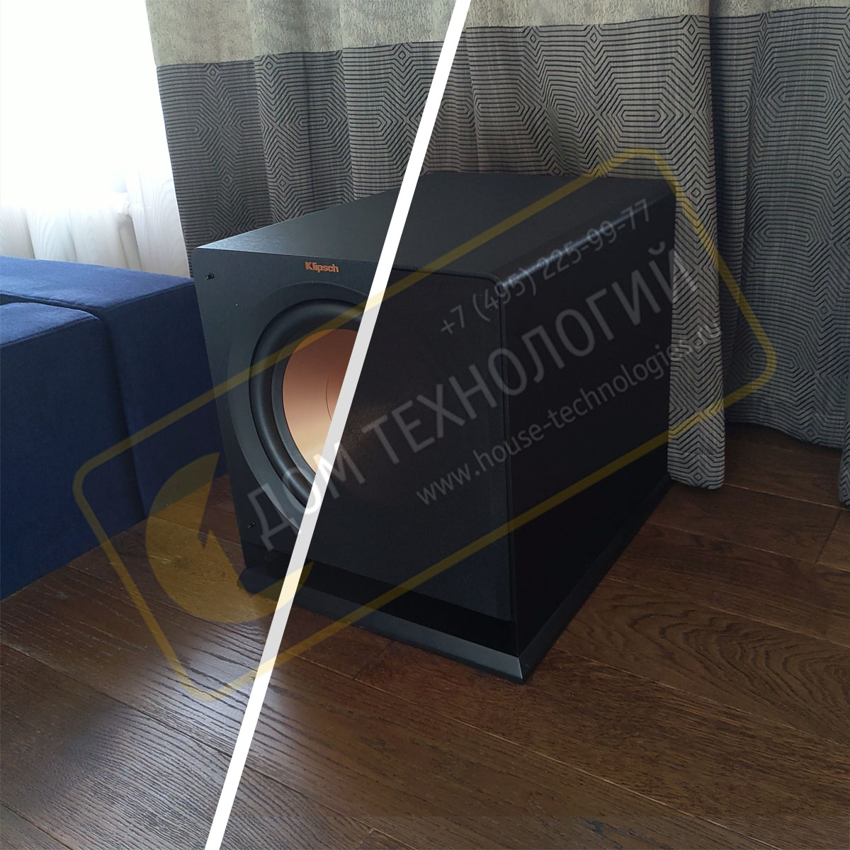 В любой системе домашнего кинотеатра, будь то отдельная комната под персональный кинозал, или обычная гостиная с более простой системой, всегда используется сабвуфер. Он может быть компактным стильным корпусом, может быть встроен в стену/потолок, а может быть обычным корпусным изделием. В данном примере, обычный корпусной сабвуфер от Klipsch размещённый за диванной группой, будет выдавать 300 Вт мощности и в пиковых нагрузках достигать 600 Вт, создавать звуковое давление до 118 дБ. Съёмная защитная сетка динамика, позволяет открыть на вид мощный и красивый диффузор динамика, открывая взгляду необычное сочетание цветов. А какое решение, закрытый динамик или открытый, Вам нравится больше?